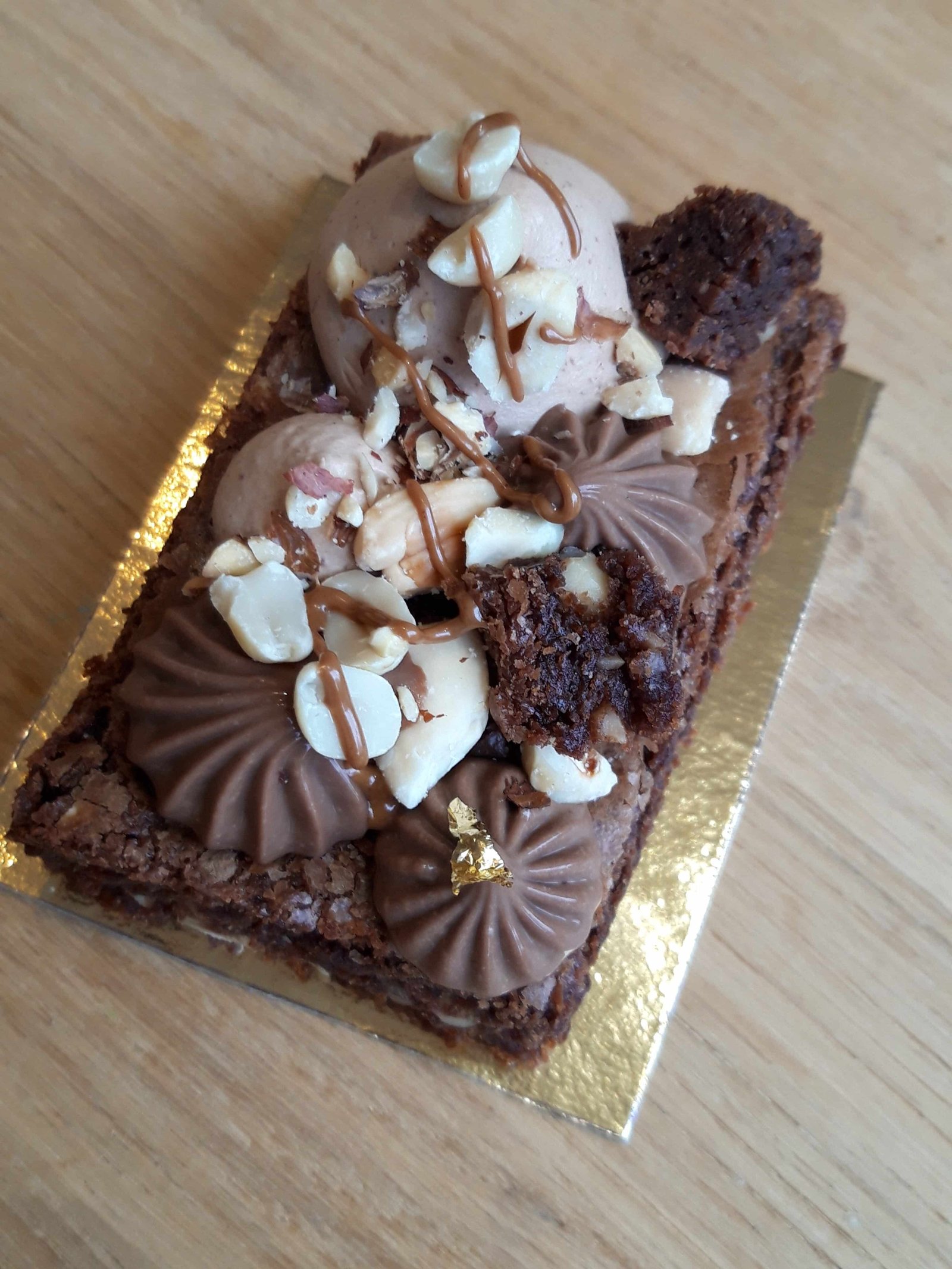Brownie aux cacahuètes, crémeux chocolat noir, chantilly chocolat lait, fruits à coque torréfiés